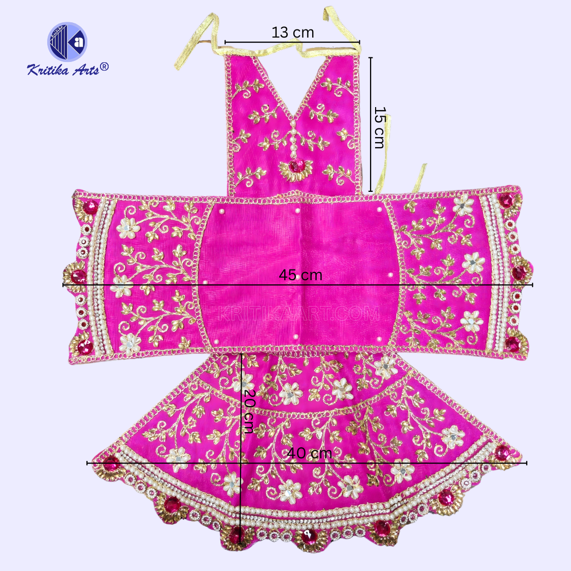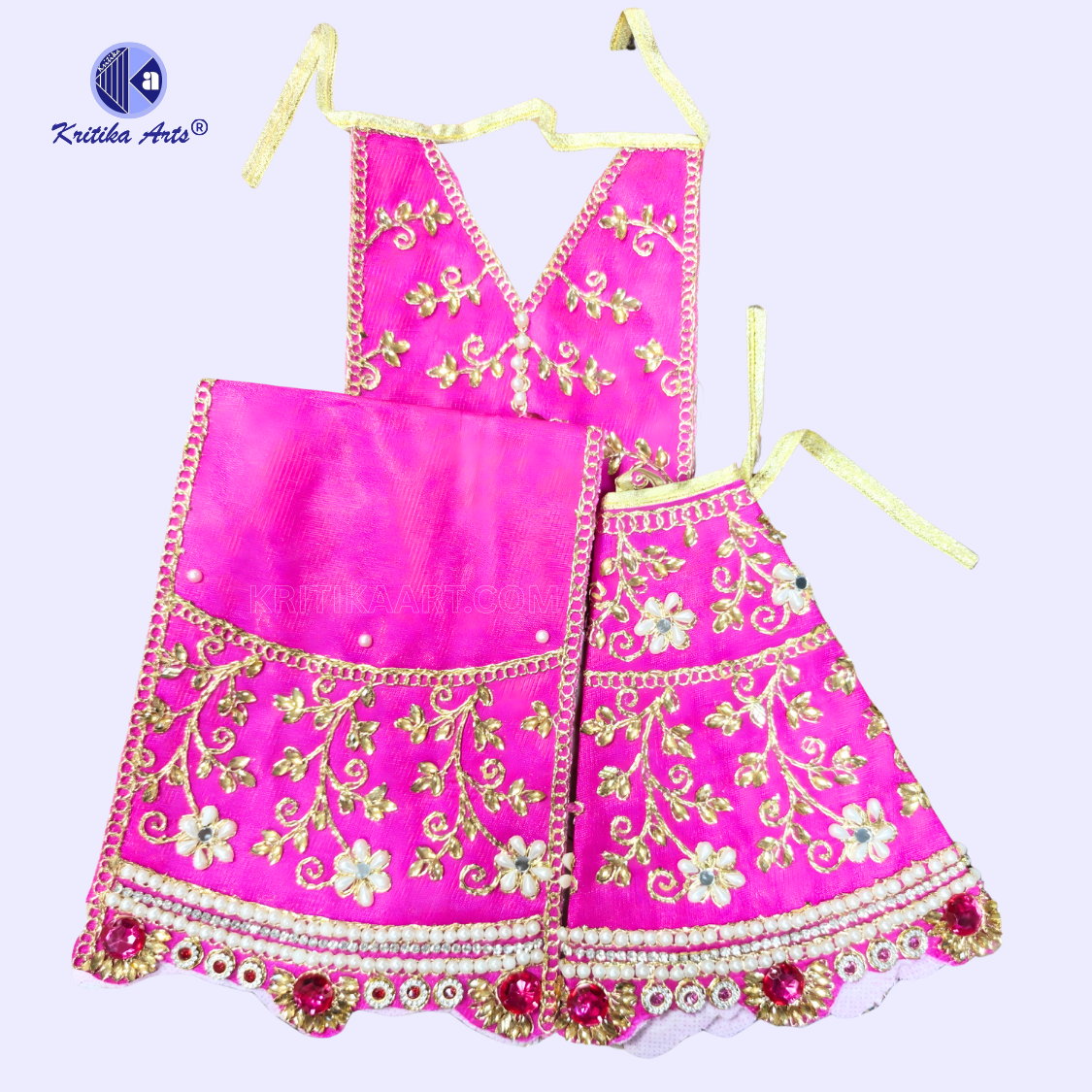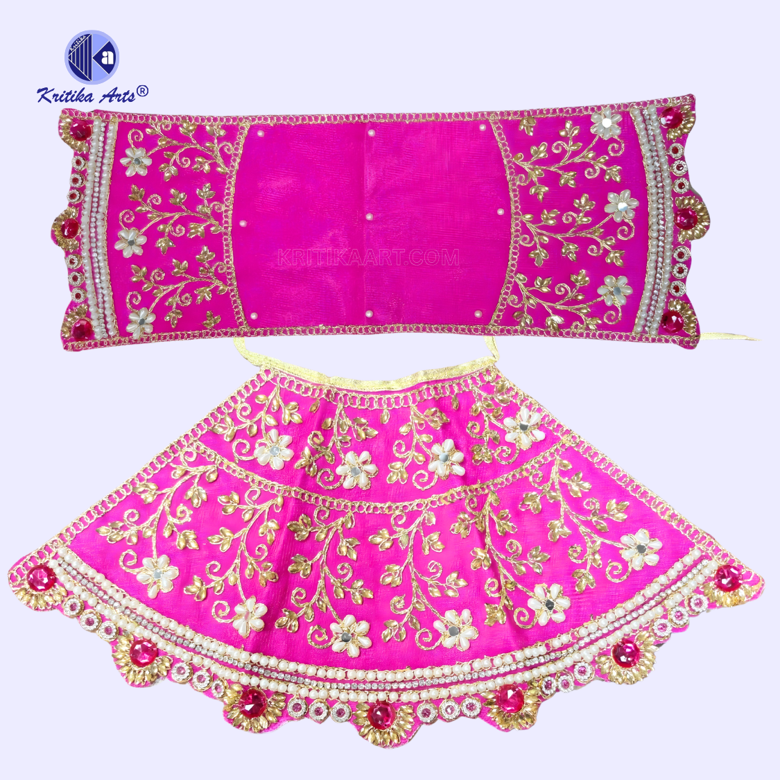 Made from premium quality pure silk fabric, this poshak features intricate zari embroidery, decorative stone work, and elegant pearl (moti) embellishments that give it a royal and devotional appearance. The vibrant color and detailed craftsmanship make it perfect for temple decoration, festive celebrations, and daily worship.