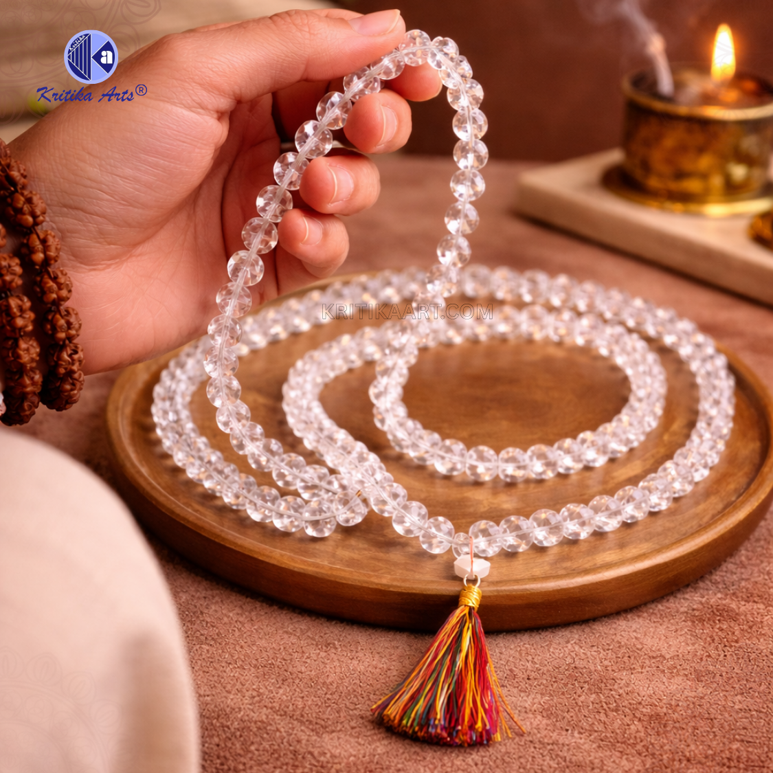 Experience the soothing energy of Pure Sphatik (Crystal Quartz) Mala, specially designed for mental peace, cooling effect & meditation focus.